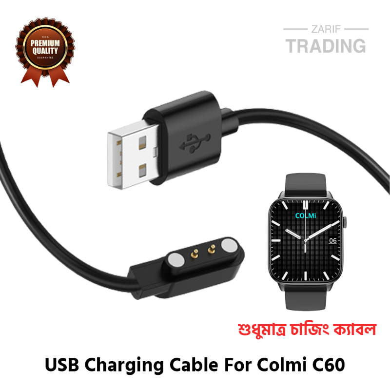 Charge your Colmi C60 Smart Watch effortlessly with this high-quality magnetic charging cable. Designed with a strong 2-pin magnetic plug, it keeps your watch securely attached to the charging dock for safe and stable charging. Compact and lightweight, it is perfect for travelers and business users. Simply plug your watch into the charging dock and connect the USB to a PC or AC charger for convenient daily use. With standard cable length, simple operation, and secure poly bag packaging, this cable ensures fast, reliable, and hassle-free magnetic charging for your Colmi C60.