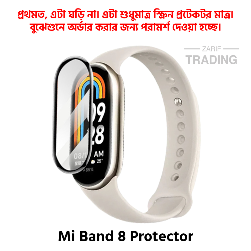 This product is a screen protector designed for the Band 8 by Xiaomi. Only the screen protector is included; a smartwatch is not included, so please read carefully before ordering. The protector provides HD high transparency protection with a scratch-resistant surface and a full coverage design. Made from durable plastic watch film using super quality material, it helps protect the display surface. Installation steps include placing the smartwatch on a flat surface, turning it off, cleaning the display with the Wet 1 wipe, drying it with the Dry 2 wipe, aligning the protector accurately, and gently removing air bubbles. Support assistance is available if needed.
